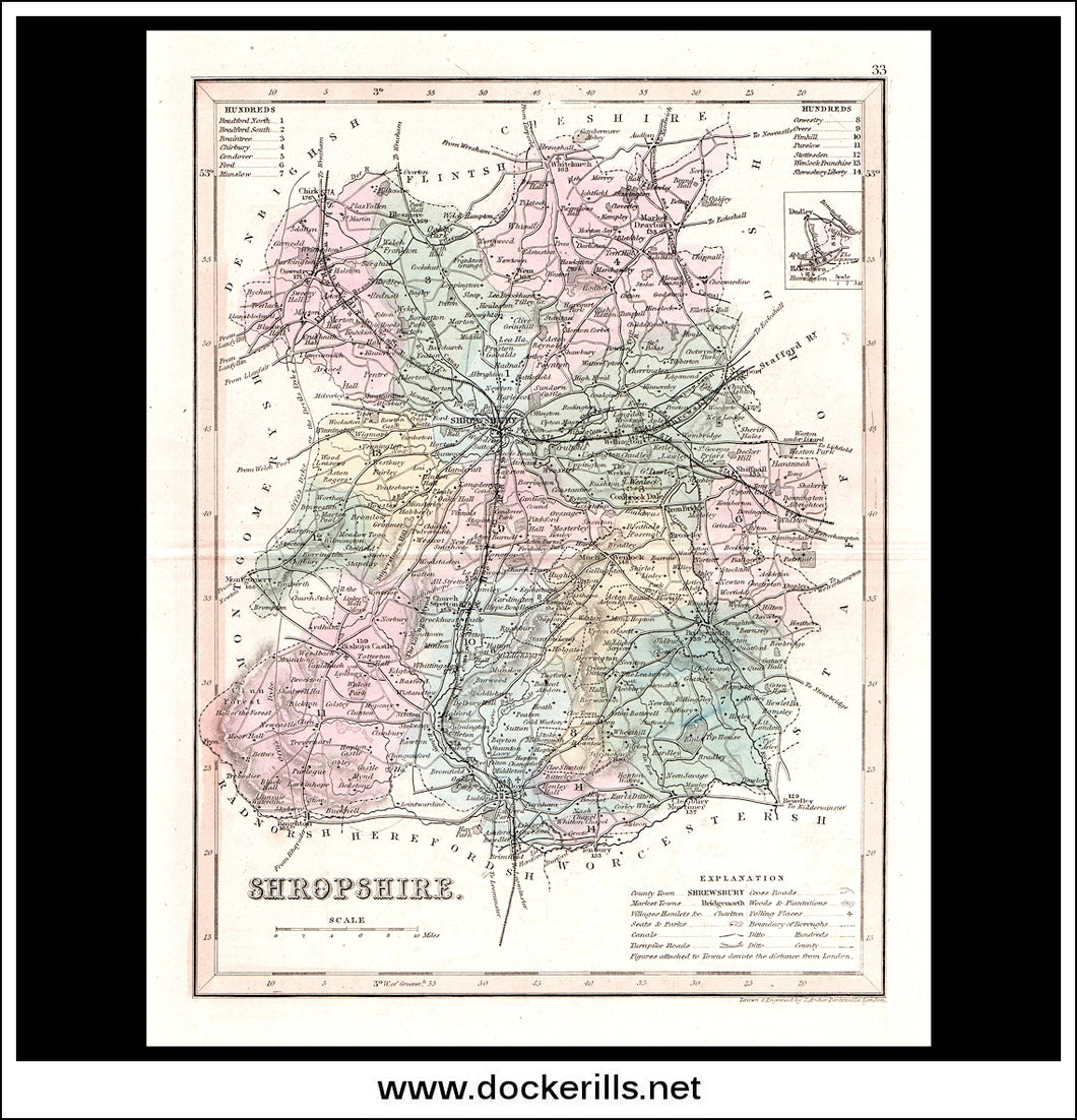 Map Of Shropshire, England. Antique Print, Steel Engraving c. 1846